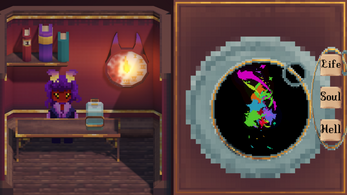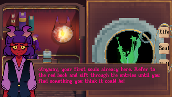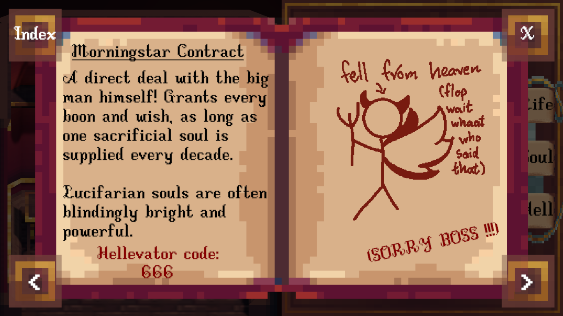 Examine various souls that have taken up devil pacts, and cross compare them with your Demonopedia, a book containing all pacts and their effects- Try to match up which souls have taken which pacts and send them to the correct devil using the hellevator!